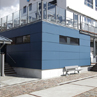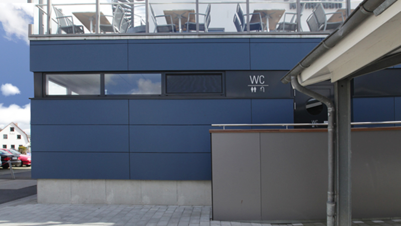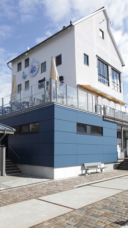 Erweiterung des für Gastronomie und Hafenmeisterei umgenutzten ehemaligen Speichergebäudes aus dem Jahr 1965 um einen Anbau mit Sanitärräumen für Gastlieger im Stadthafen.