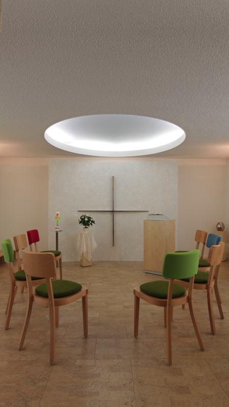 Die Stimmung eines Sakralraumes wird durch die Zentrierung des Raums, die Lichtführung und die Beschränkung in der Materialwahl erreicht.