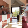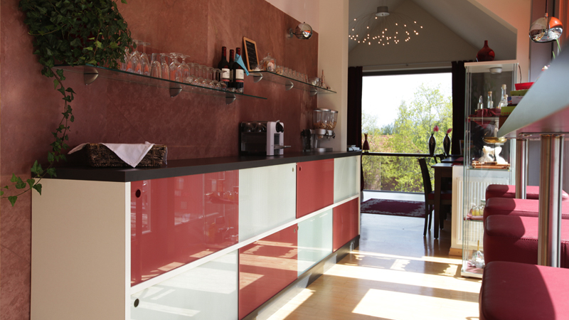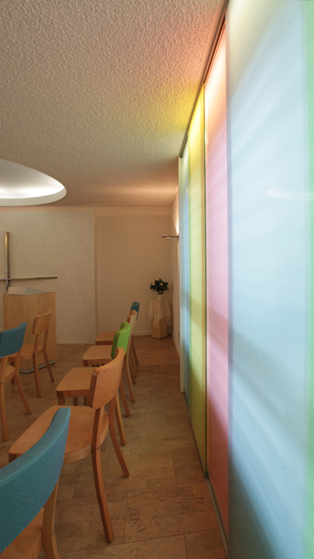 Vor die Fenster gestellte raumhohe farbige Glasscheiben verteilen das einfallende Licht gleichmäßig, implizieren die Assoziation an Kirchenfenster und lassen den Raum wohltuend introvertiert erscheinen.