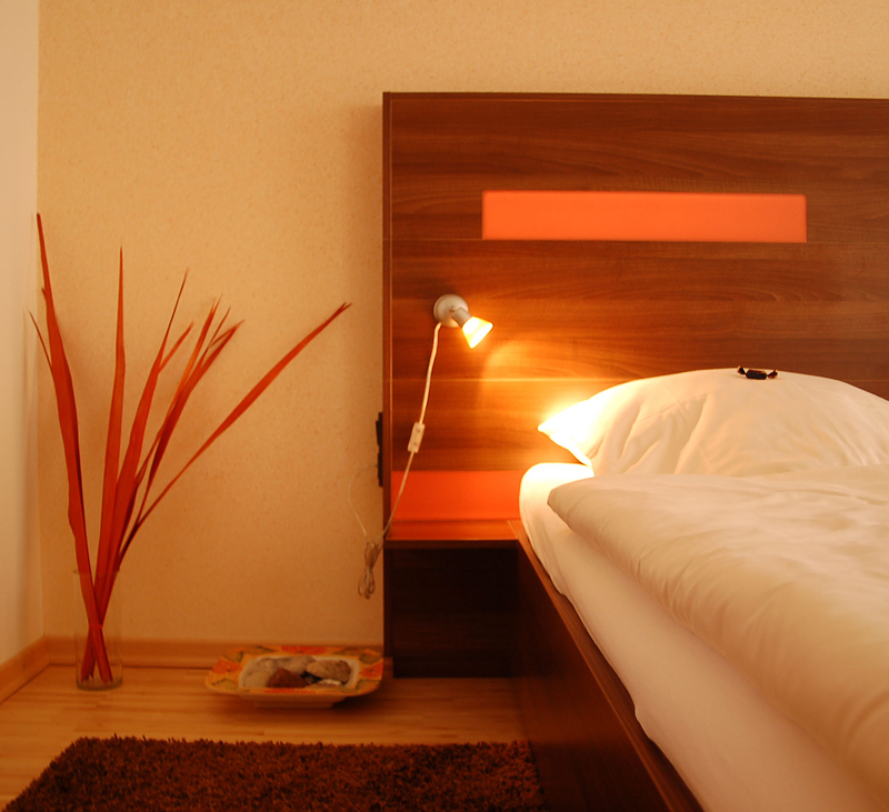 Das Mobiliar des Hotels wurde auf die Raumzuschnitte abgestimmt geplant und angefertigt. Raumweise wurden verschiedene Material- und Farbstimmungen gewählt. Die Inneneinrichtung des Hotels wird zu Demonstrationszwecken genutzt.