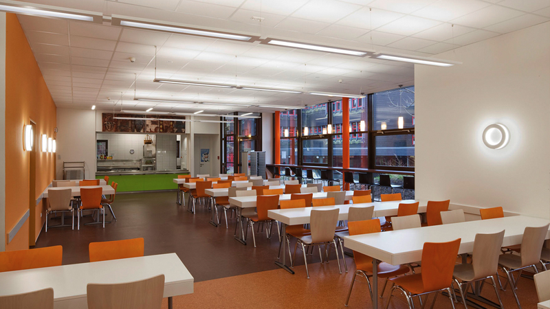 Errichtung eines freistehenden Multifunktionsbaus, der als nördliche Platzwand des Pausenhofes mit seiner großen Glasfront Wechselbeziehungen zwischen Innen und Außen herstellt. Da das Gebäude als Einzelbaukörper errichtet wurde, ist es unabhängig von Schulöffnungszeiten auch für Sonderveranstaltungen nutzbar.